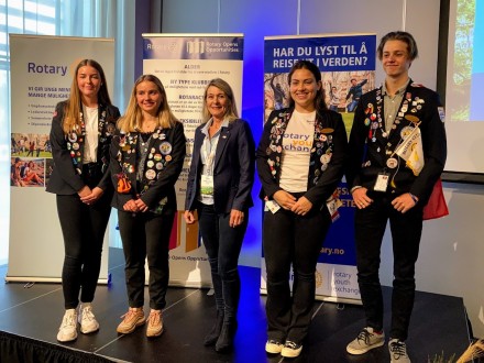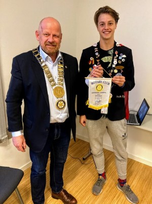 utveksling med Rotary for de som er interessert i å reise ut. Vertsklubbens vimpel ble innledningsvis overrakt til vår klubbpresident. På det første bildet ser vi distriktets leder for ungdomsutveksling Elln R O Strand med de 4 som reiste ut fra Trøndelag i året 19/20.